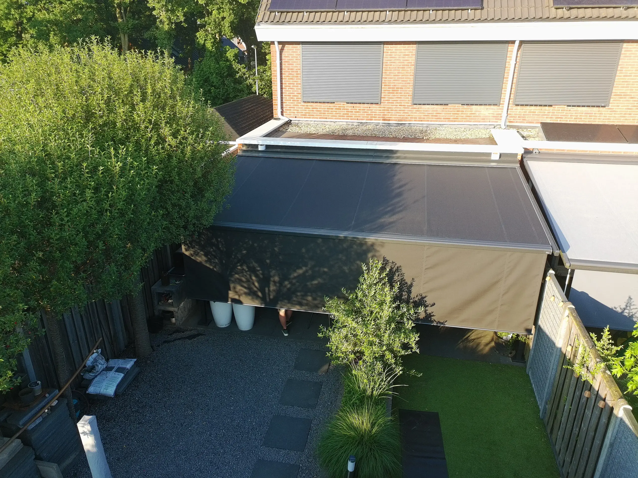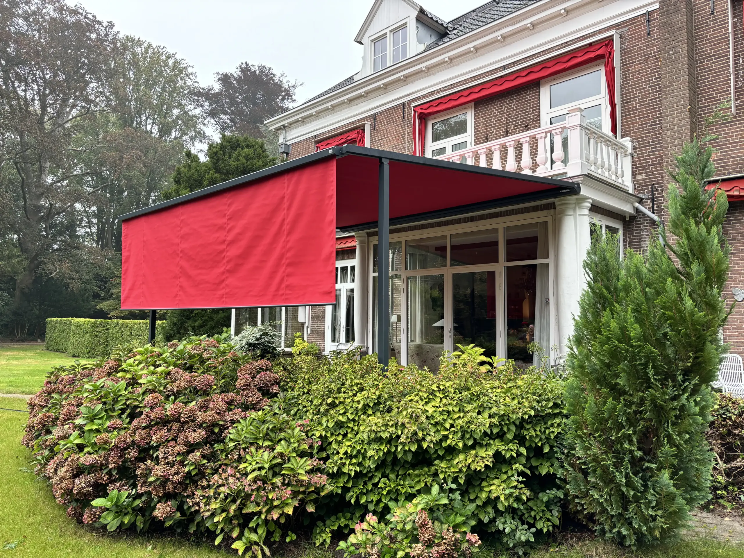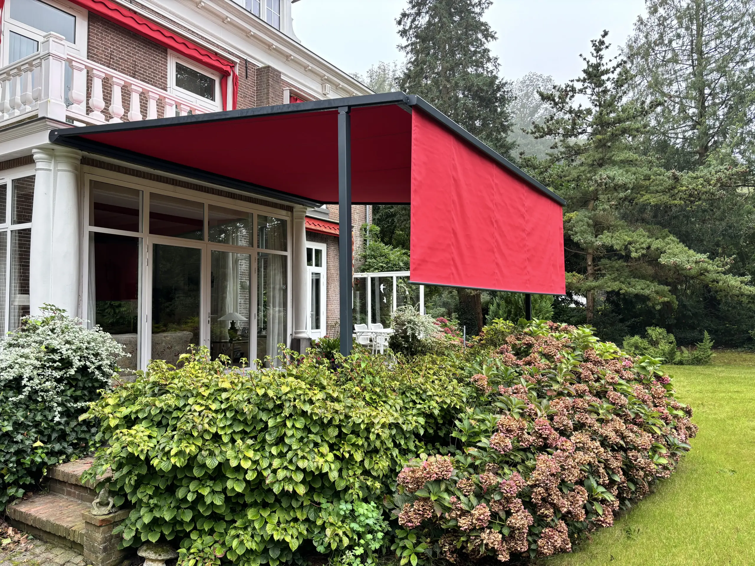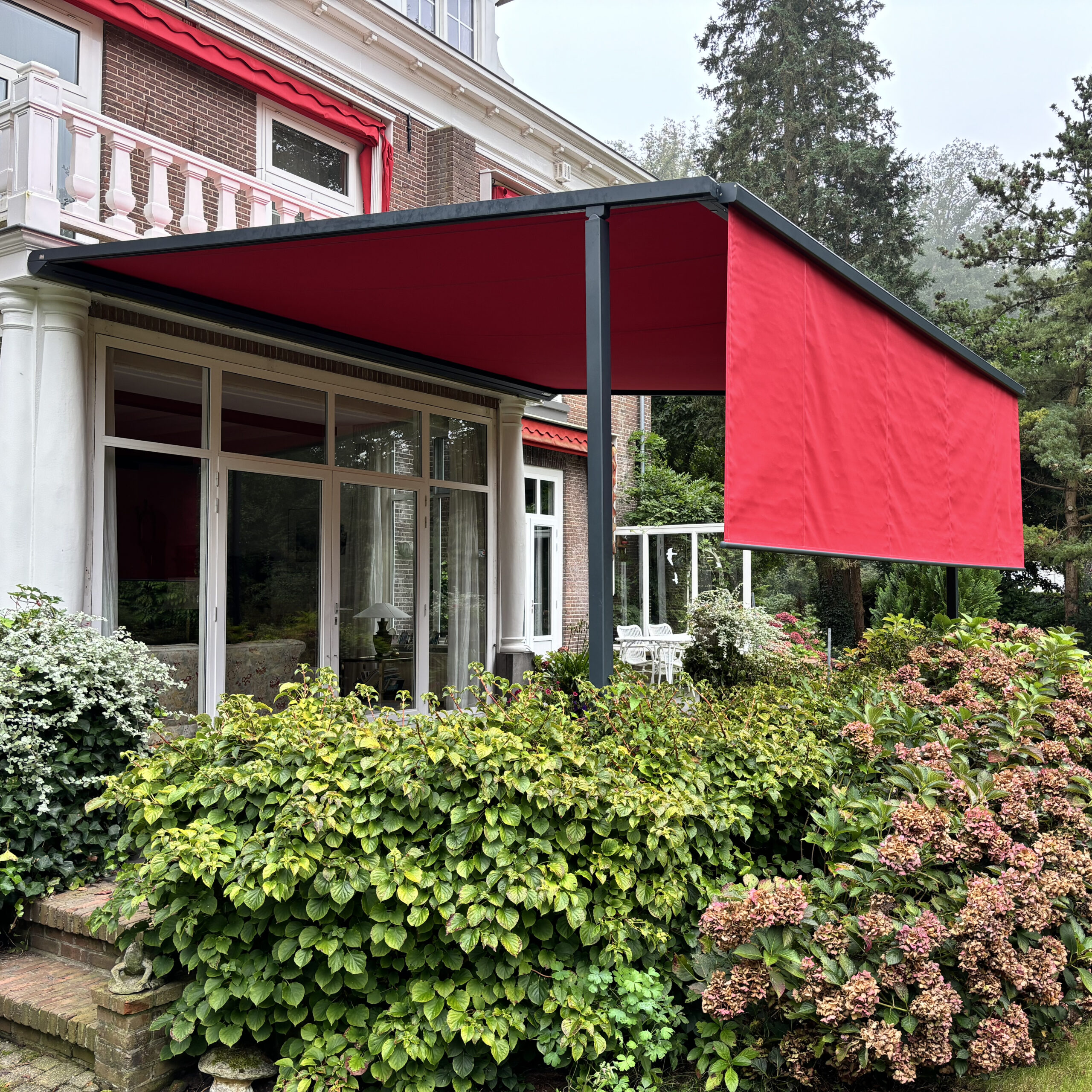 Een textieloverkapping (pergola zonwering) heeft een eigen onderconstructie. Daardoor komen er minder krachten op de gevel dan bij een terrasscherm en is plaatsing vaak breder toepasbaar. Bovendien zijn grote uitvallen mogelijk, in sommige situaties zelfs groter dan de breedte van het systeem. Het resultaat is een stabiele schaduwplek die ook bij wisselvallig weer prettig blijft aanvoelen.
