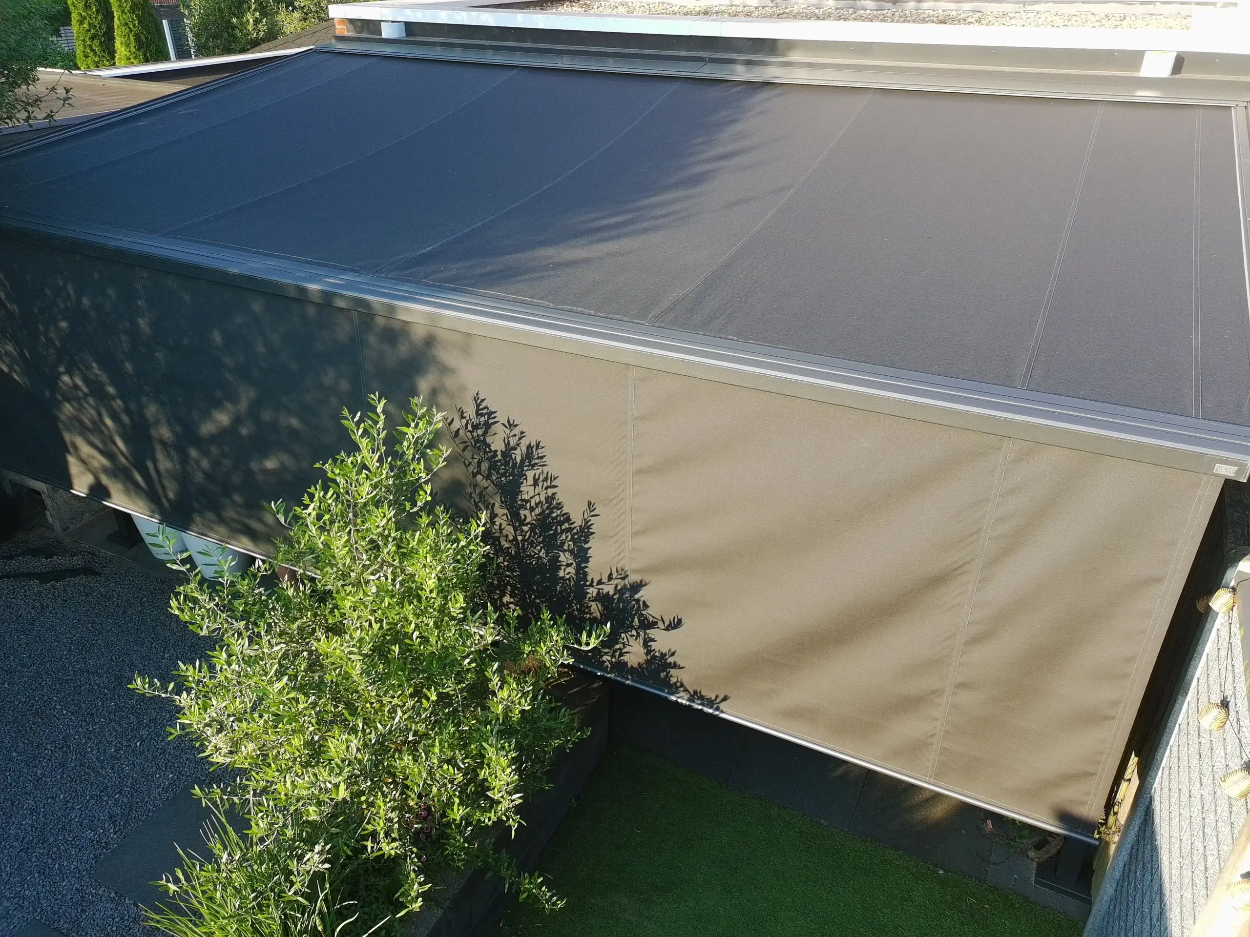 Heb je een serre of overkapping met glazen dak? Dan biedt serre zonwering uitkomst. Het doek loopt in geleiders over rails die bovenop de bestaande dakconstructie worden geplaatst, vaak net vrij van het glas voor luchtcirculatie. Daarmee blijft de temperatuur onder het dak beter beheersbaar en wordt fel licht gefilterd. Je behoudt zicht en kunt de zonwering precies positioneren waar de zon staat.